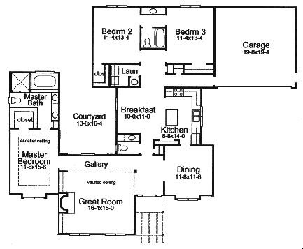 ranch home creates its own view with a central courtyard. A large, open, vaulted Great Room sets the tone